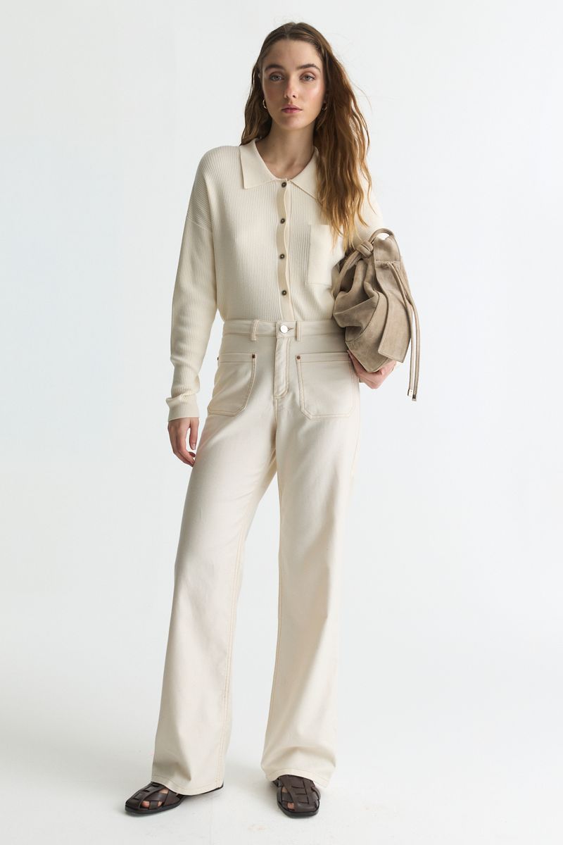 Jean de tiro alto, calce rejalado, tiro a la cintura y pierna wide leg. Realizado en una sarga liviana de composición 100% algodón