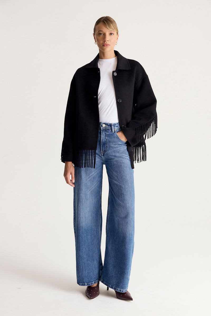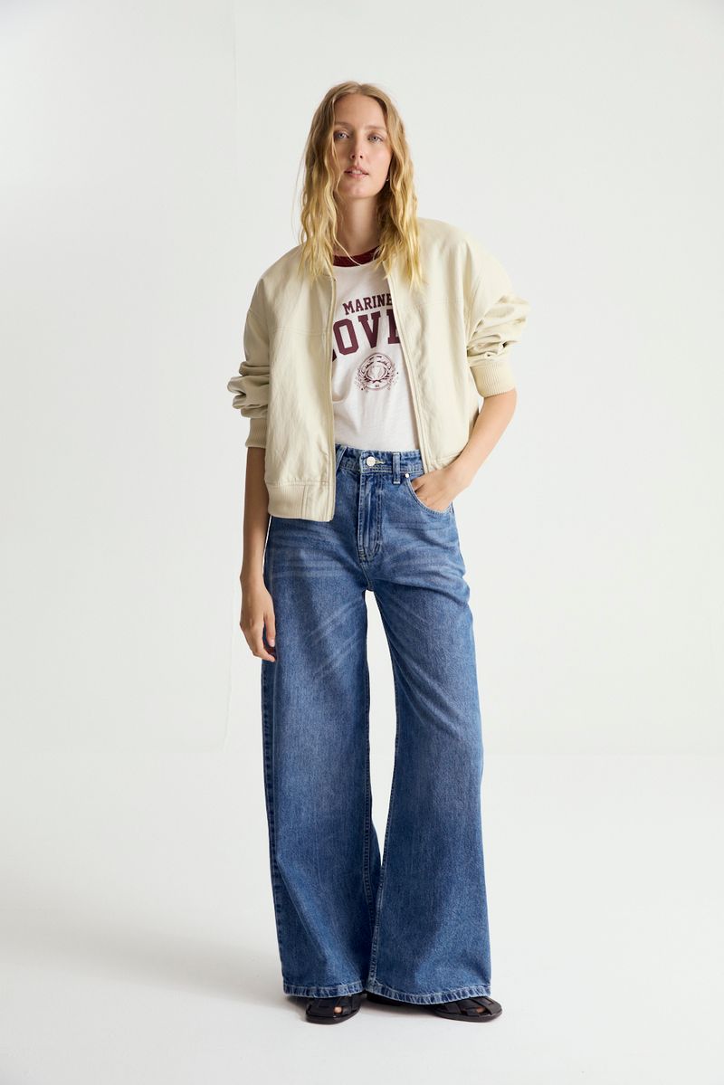 Jean de calce holgado, tiro bajo y pierna bien ancha. Lleva detalle de presillas ornamentales en la cintura. Realizado en tejido rígido 100% algodón bien liviano