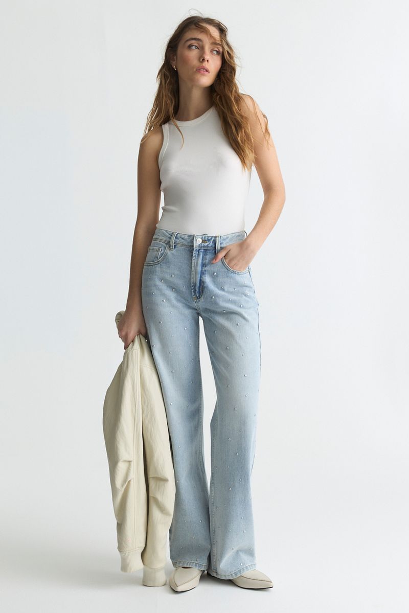 Jean de tiro alto y calce regular. Tiene pierna amplia y está realizado en tejido rígido 100% algodón. Lleva efecto lavado celeste y detalle de tachas termofijadas en todo el delantero.