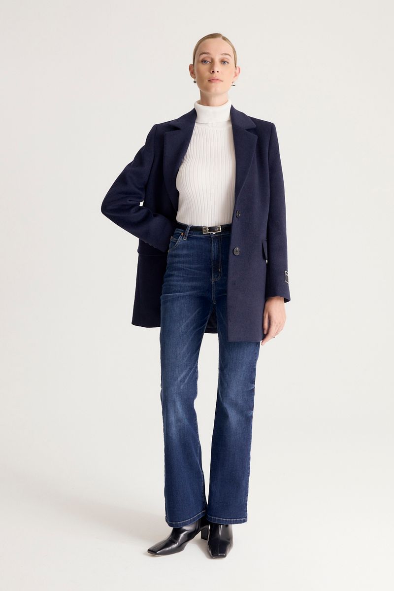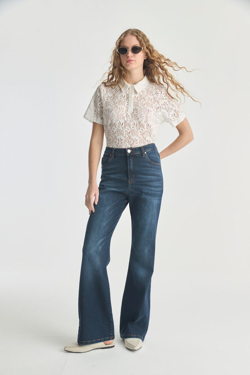 Jean de tiro alto, calce algo ajustado en piernas y efecto flare desde la rodilla hacia los ruedos. Realizado en denim de algodón con confort. Lleva efecto de lavado agresivo con bigotes y contrastes fuertes