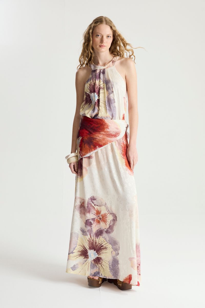 Vestido largo full print digital,confeccionado en jacquard.escote halter con calce regular.