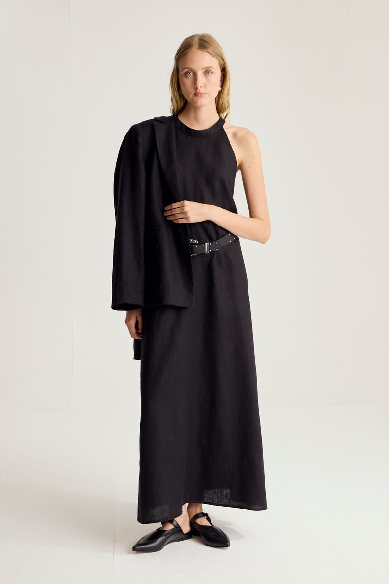 Vestido largo 100%lino, con escote healter que se ata en espalda con una gota. Silueta suelta y tajo lateral.
