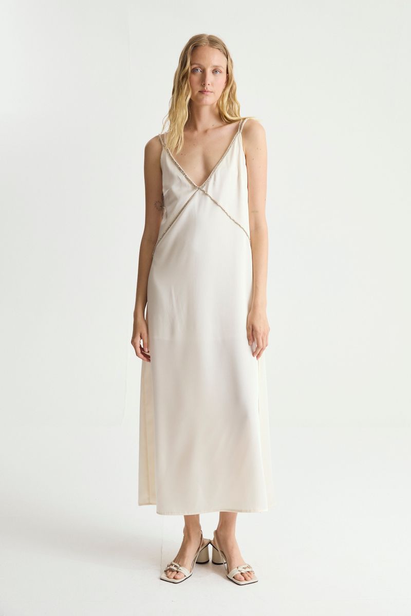 Vestido midi ligeramente evase de satén con detalle de strass en frente y espalda. Tiene cierre invisible y tiras ajustables.