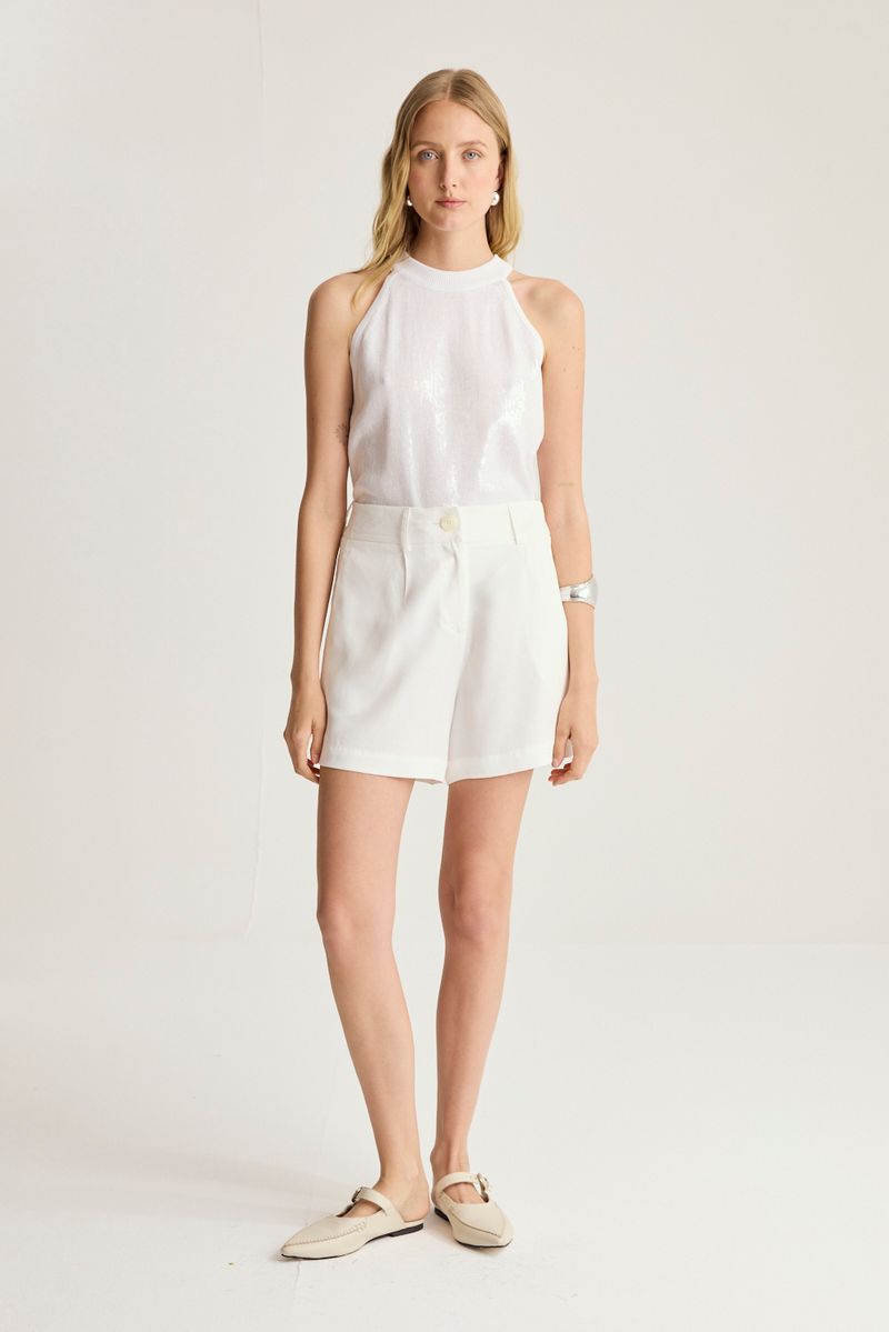 Bermda de tencel twill, tiro alto con boton en cintura y bolsillos laterales. Lleva pinzas en frente y largo arriba de la rodilla. Este articulo es 100%tencel.