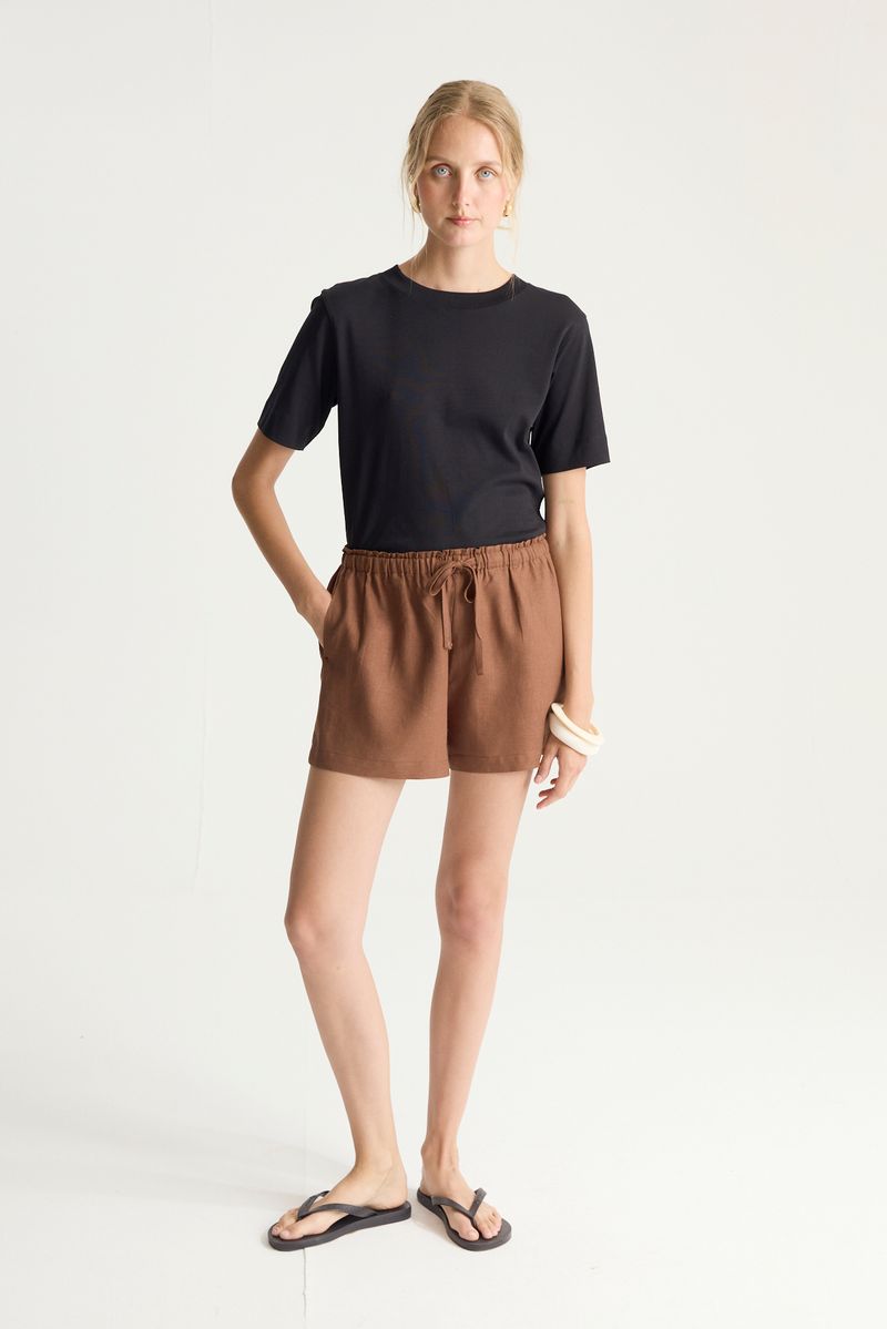 Short de lino viscosa, con elastico en cintura, tirita para atar ybolsillos laterales .