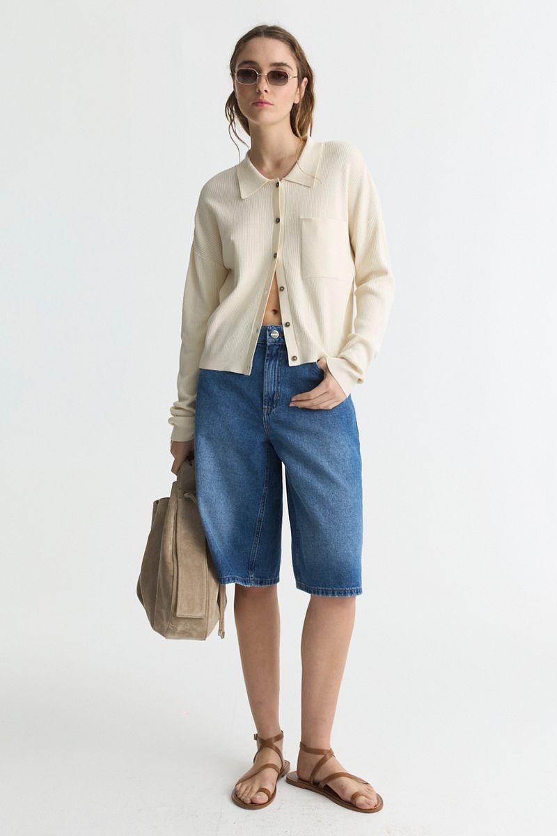 Bermuda de calce bien holgado hasta la rodilla y tiro medio. Realizado en denim rígido 100% algodón