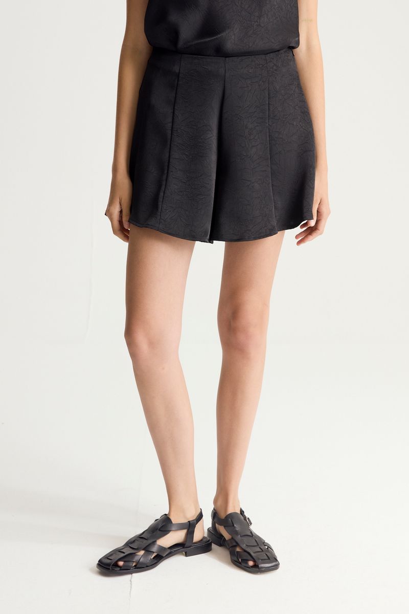 Short de calce regular, tiro alto y mucho vuelo en los ruedos. De textil simil saten bien liviano y fluído, se accede a traves de un cierre invisible lateral