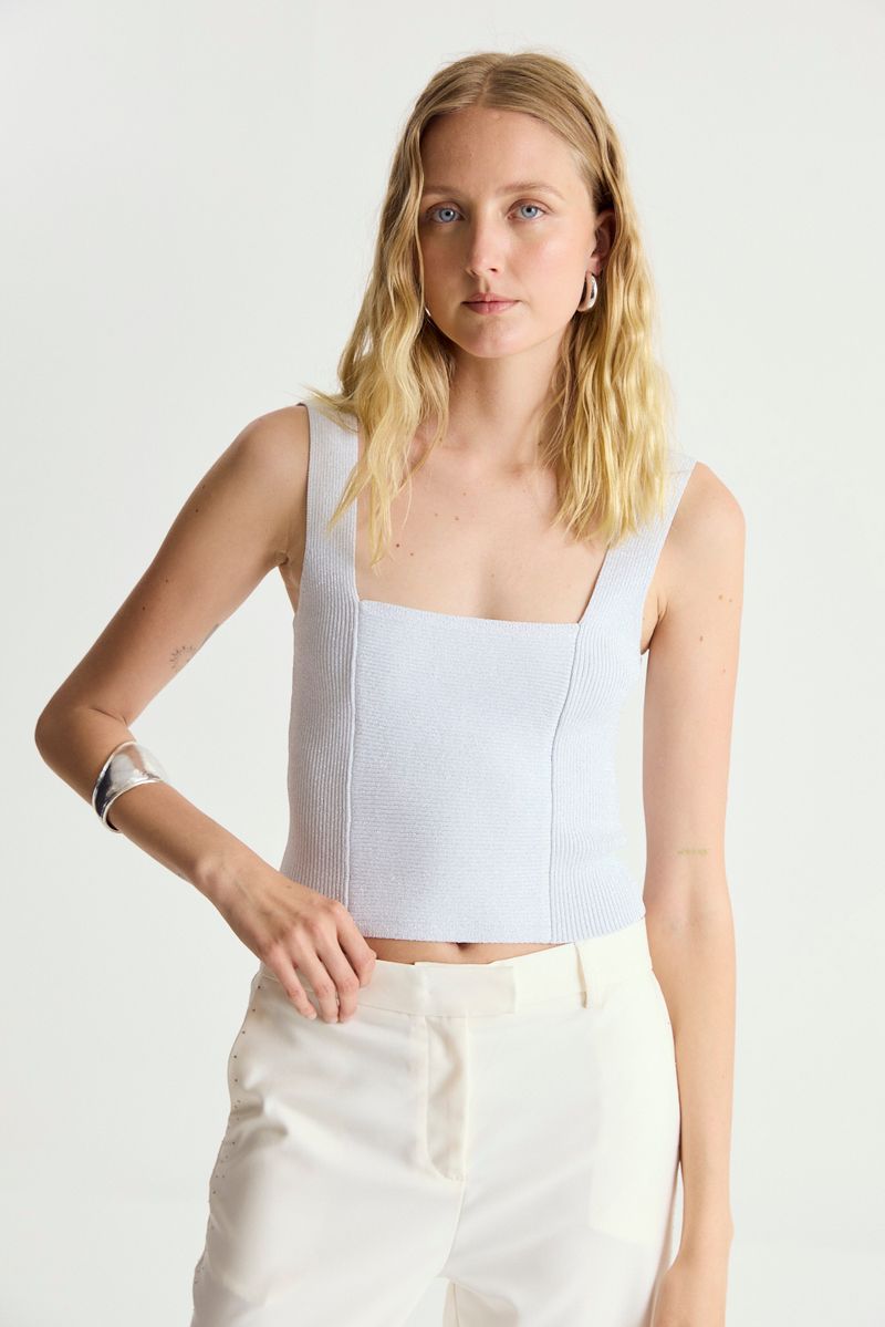 Top tejido con lurex de calce ajustado y escote cuadrado.