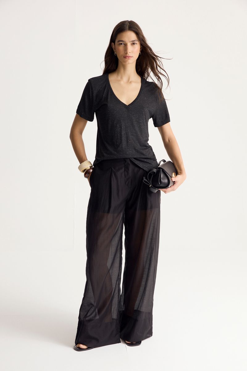 Remera de calce regular con escote abierto con tirilla tejida y manga corta confeccionada en jersey de viscosa con lurex de hilos metalicos