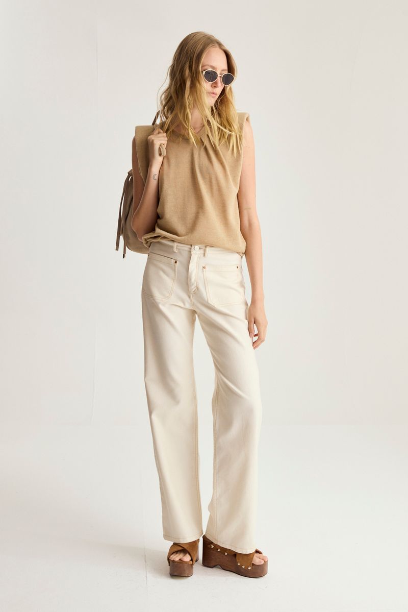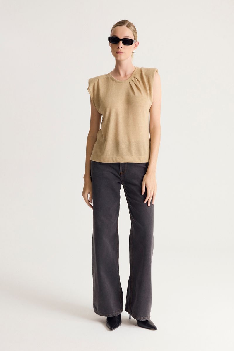 Remera de calce regular sin mangas, con escote redondo, hombreras y detalle de tablas en escote para generar volumen