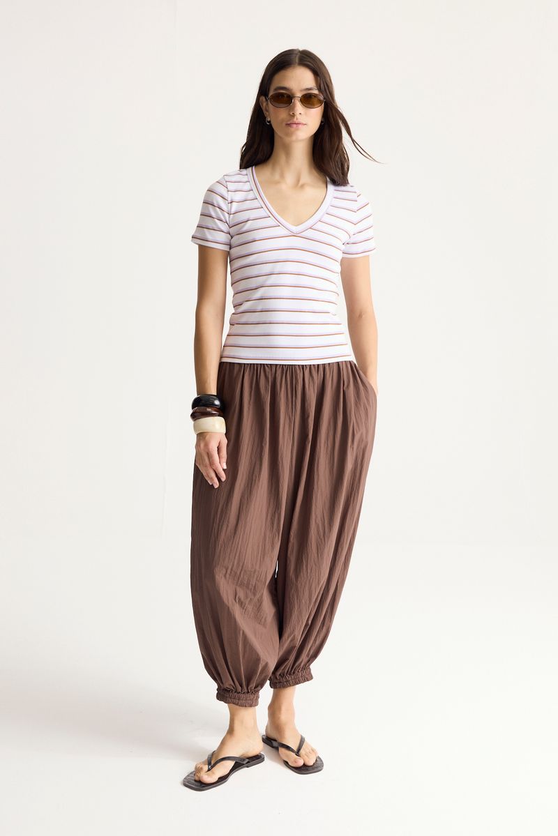 Remera de calce ajustado con escote en v profundo y manga corta confeccionada en morley rayado tejido.