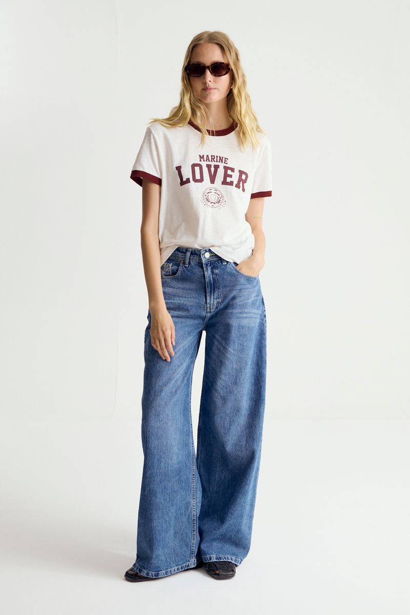 Remera de calce regular con cuello y puños de mnaga a contracolor y estampa central exclusiva de la temporada confeccionada en jersey flamé 100% algodón sostenible con certificación bci