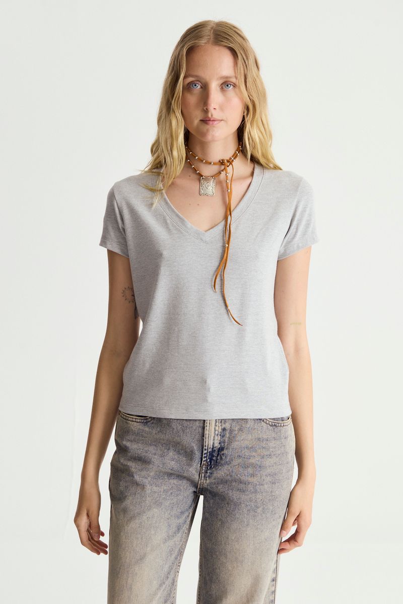 Remera básica de calce ajustado con escote en v profundo y manga corta confeccionada en algodón con elastano.