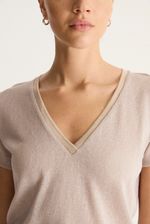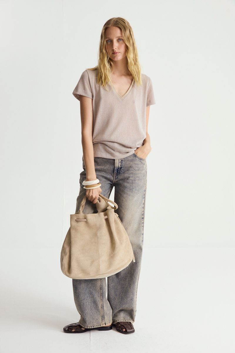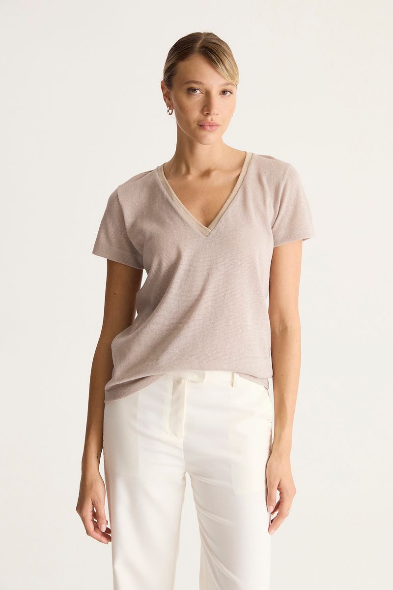 Remera de calce regular con escote redondo con cuello tejido confeccionada en jersey de trama abierta con entretejido de lentejuelas
