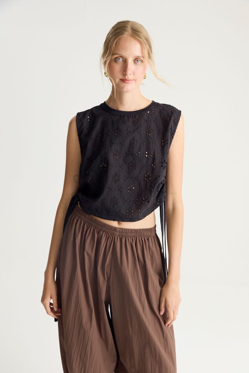Remera de calce relajado con escote redondo, sin mangas y detalles de jaretas laterales para fruncir y acortar. Confeccionada en broderie 100% algodon