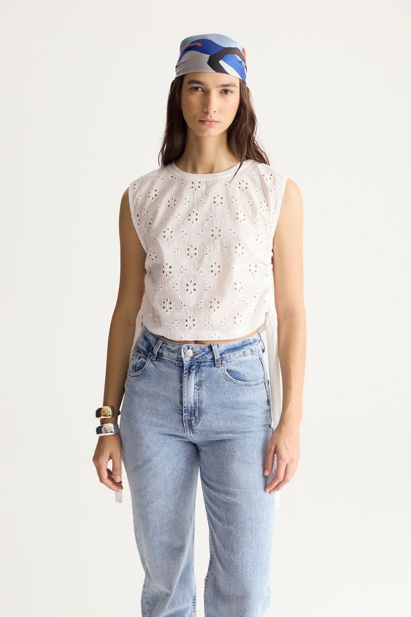 Remera de calce relajado con escote redondo, sin mangas y detalles de jaretas laterales para fruncir y acortar. Confeccionada en broderie 100% algodon