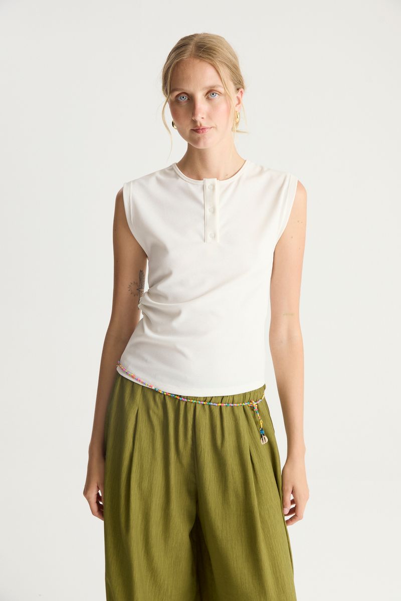 Remera de calce ajustado con escote redondo, manga americana y cartera con botones confeccionada en ribb compacto con foil