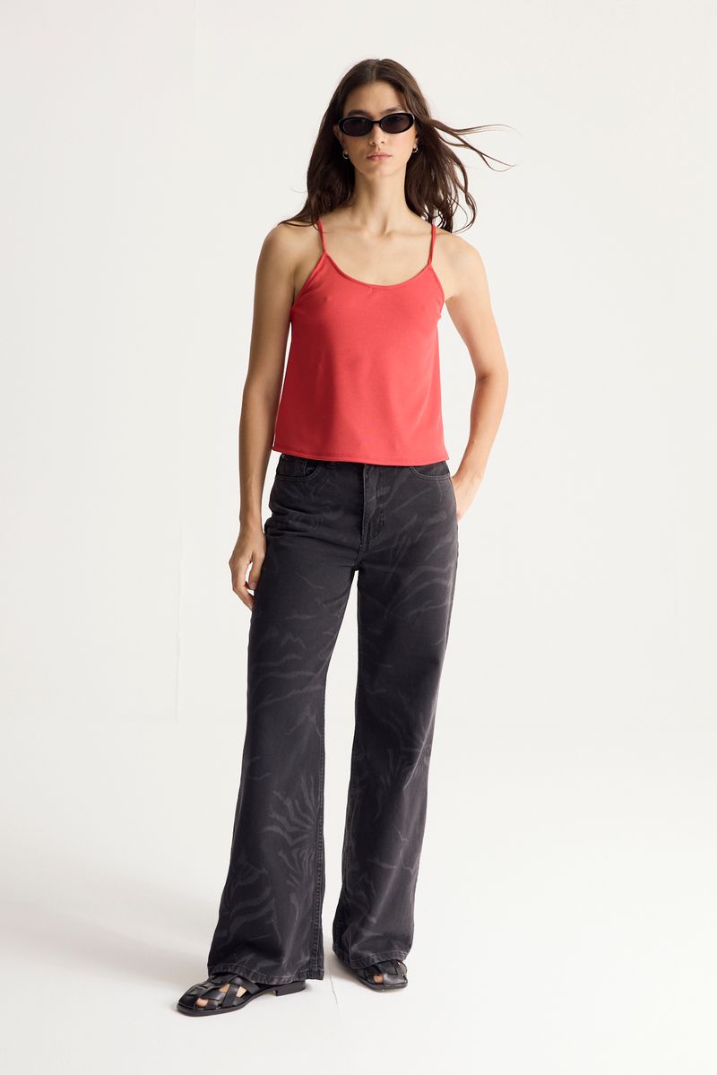 Musculosa de calce regular ligeramente evasé con doble bretel finito con detalle de anudado en espalda confeccionada en ribb compacto con foil
