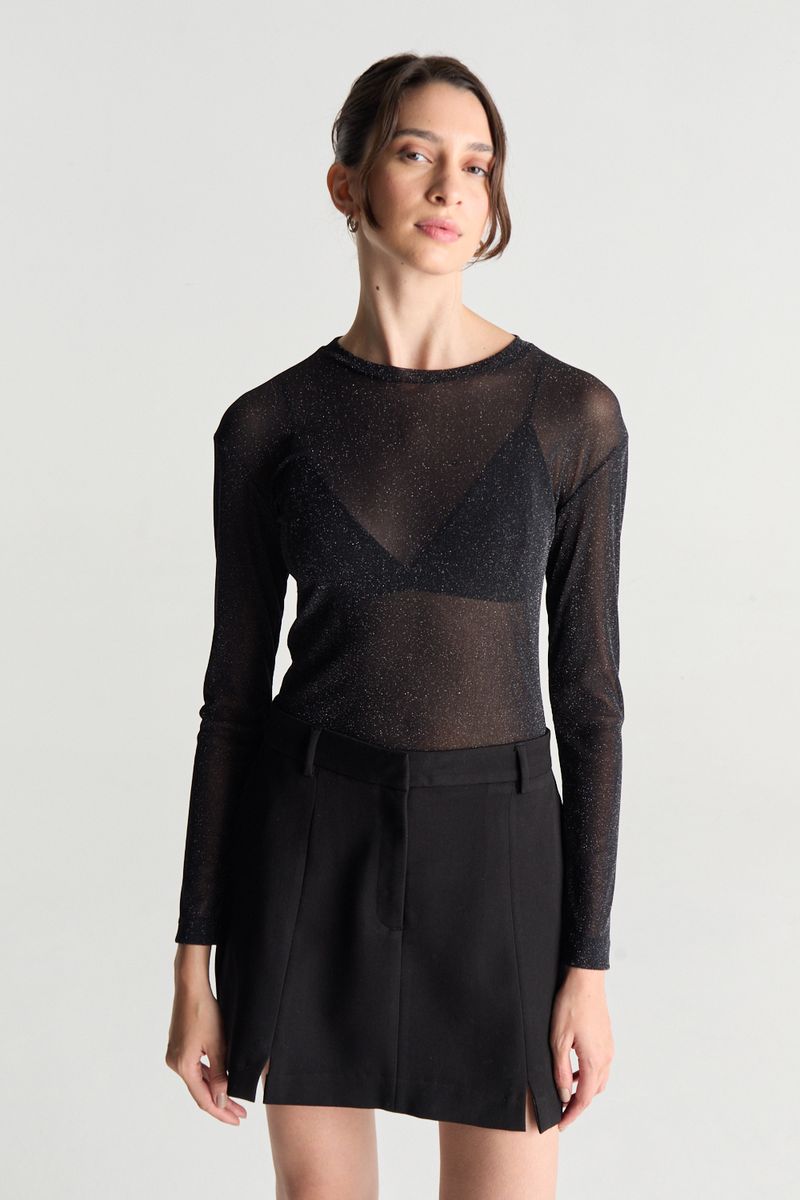 Remera de calce ajustado con escote redondo y manga larga en tejido transparente con lurex ideal para usar con top o corpiño de encaje debajo