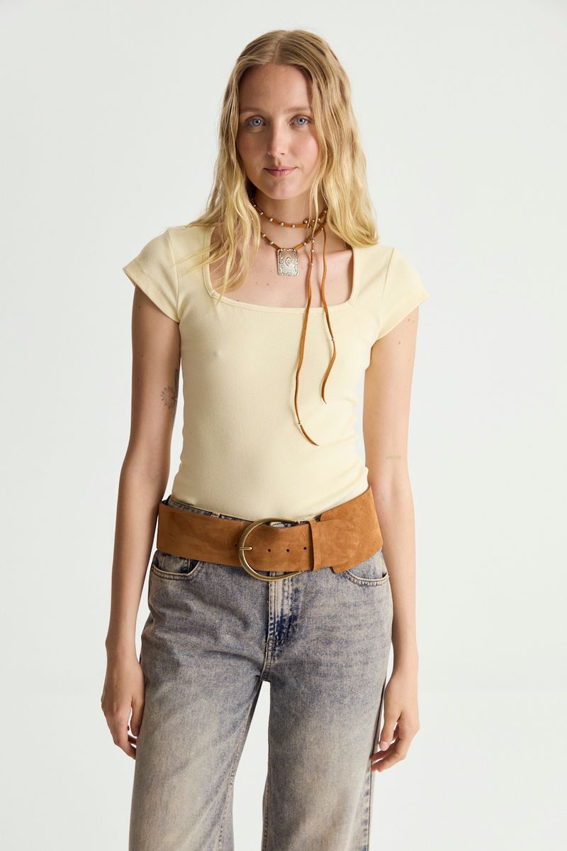 Remera de calce ajustado con escote abierto cuadrado y manga corta en rib de algodón de calidad premium