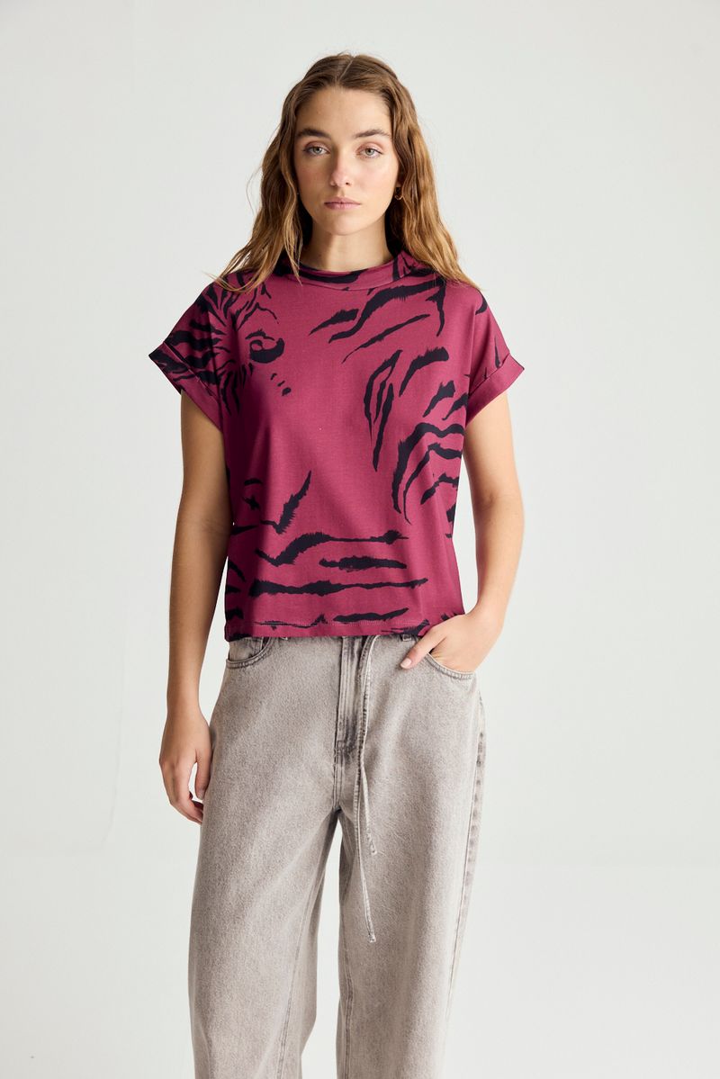 Remera de calce relajado con escote alto y manga amaericana, conefeccionada en jersey estampado exclusivo digital 100% algodon bci de calidad sustentable.