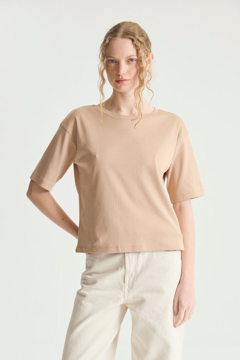 Remera de calce relajado con escote redondo, manga corta y detalle de espalda cruzada confeccionada en perú en interloque de calidda premium 100% algodon pima