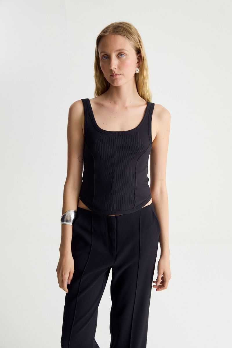 Musculosa de calce ajustado con escote abierto y recortes en delantero look corset en morley de basta fina de calidda premium