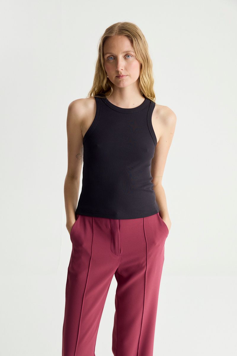 Musculosa de calce ajustado con escote alto y breteles angostos en ribb de basta fina de calidad premium