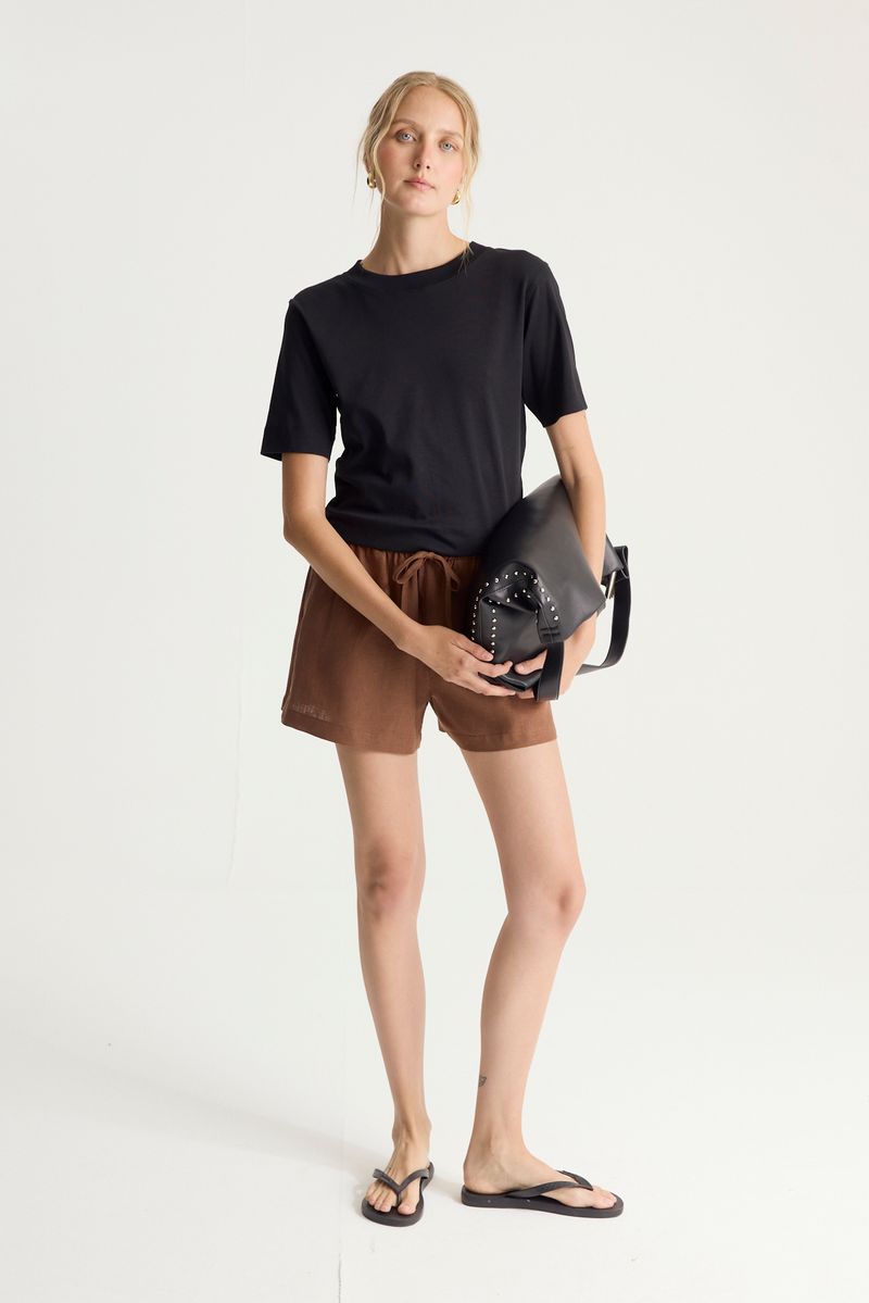 Remera de calce regular con escote a la base, manga corta y detalles de costuras confeccionada en perú en interloque de calidad premium 100% algodón pima
