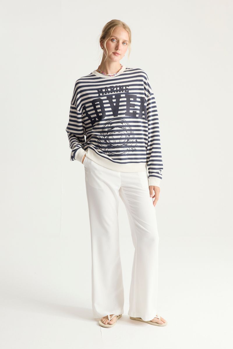 Buzo rayado de calce relajado con escote redondo y estampa central con altura en delantero confeccionado en perú en french terry 100% algodón de calidad premium rayado