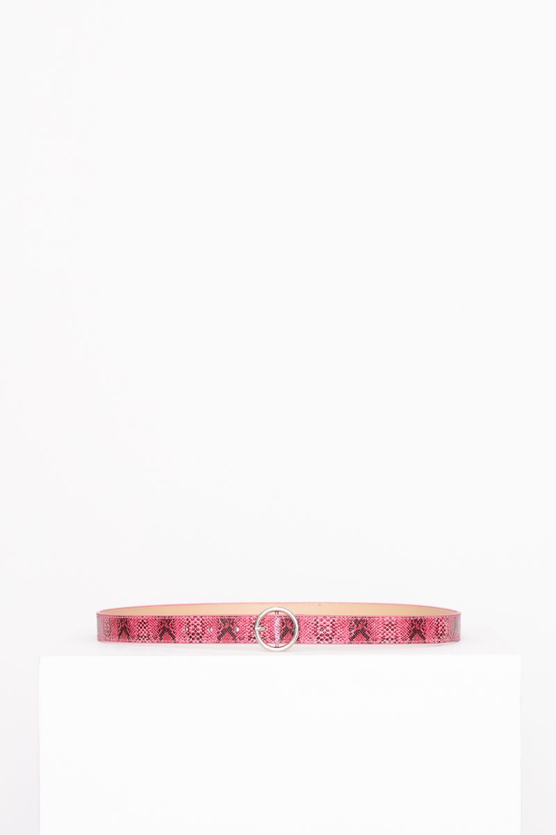 Cinto realizado en símil cuero serpiente en colores con hebilla circular metálica