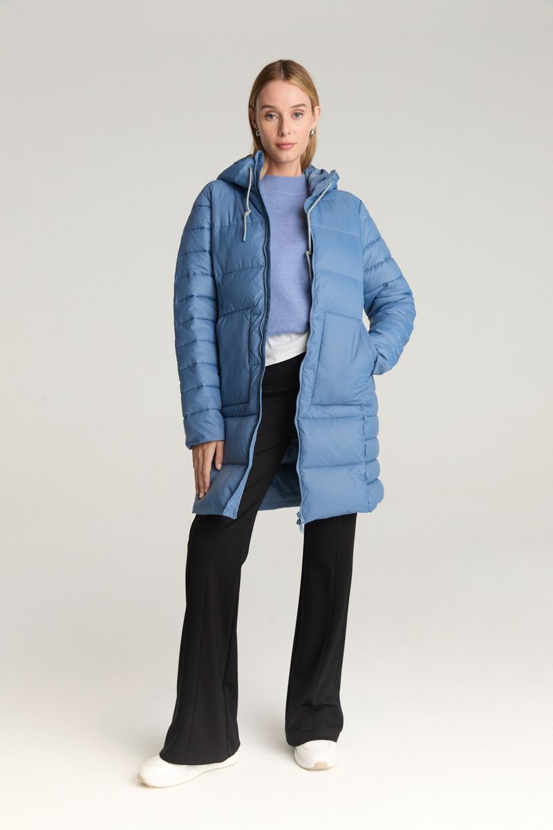 Campera de calce regular y larga por las rodillas. Tiene bolsillos plaqué en el delantero y capucha. Es ultra light pero bien abrigada y trae una bolsa para guardar la campera.