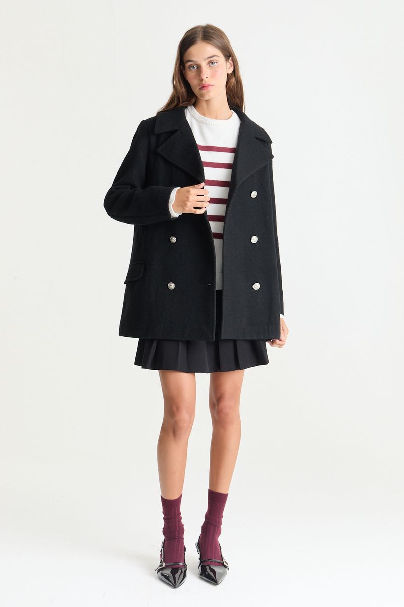 Abrigo corto de paño marine doble abotonadura, con leve entalle en silueta. Lleva doble bolsillo en frente y cuello con solapa sastrera. Largo modular, debajo de seguda cadera