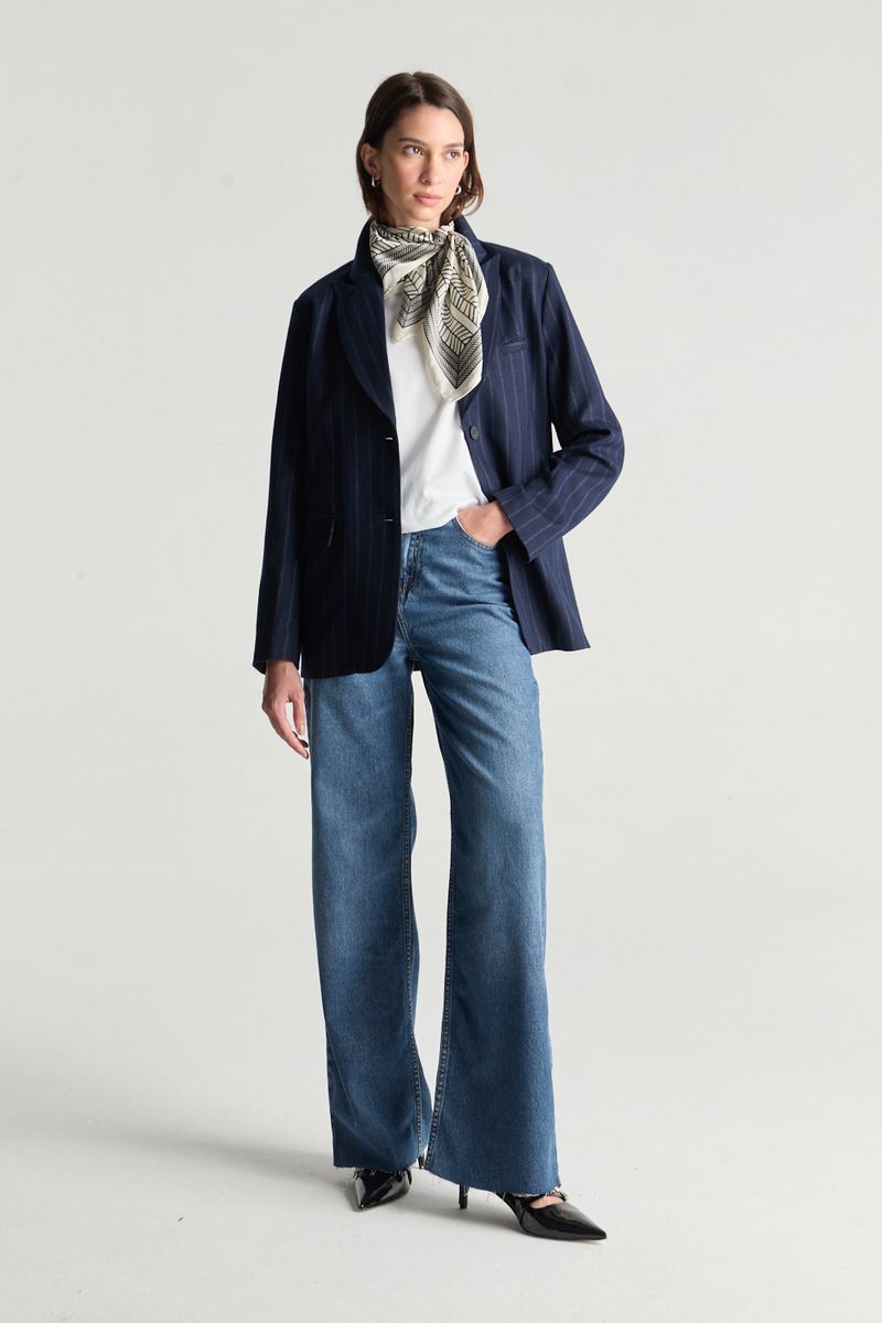 Blazer sastrero tizado con solapa sastrera y doble abotonadura recta en frente. Lleva bolsillos con tapa y tajo en espalda para su mayor confort en movimiento.