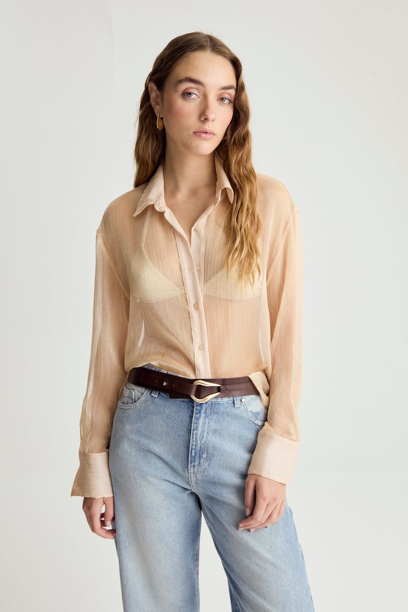 Camisa de calce regular confeccioanda en organza ,con cuello y cartera con botones. Tiene ruedo curvo y manga con tablas.