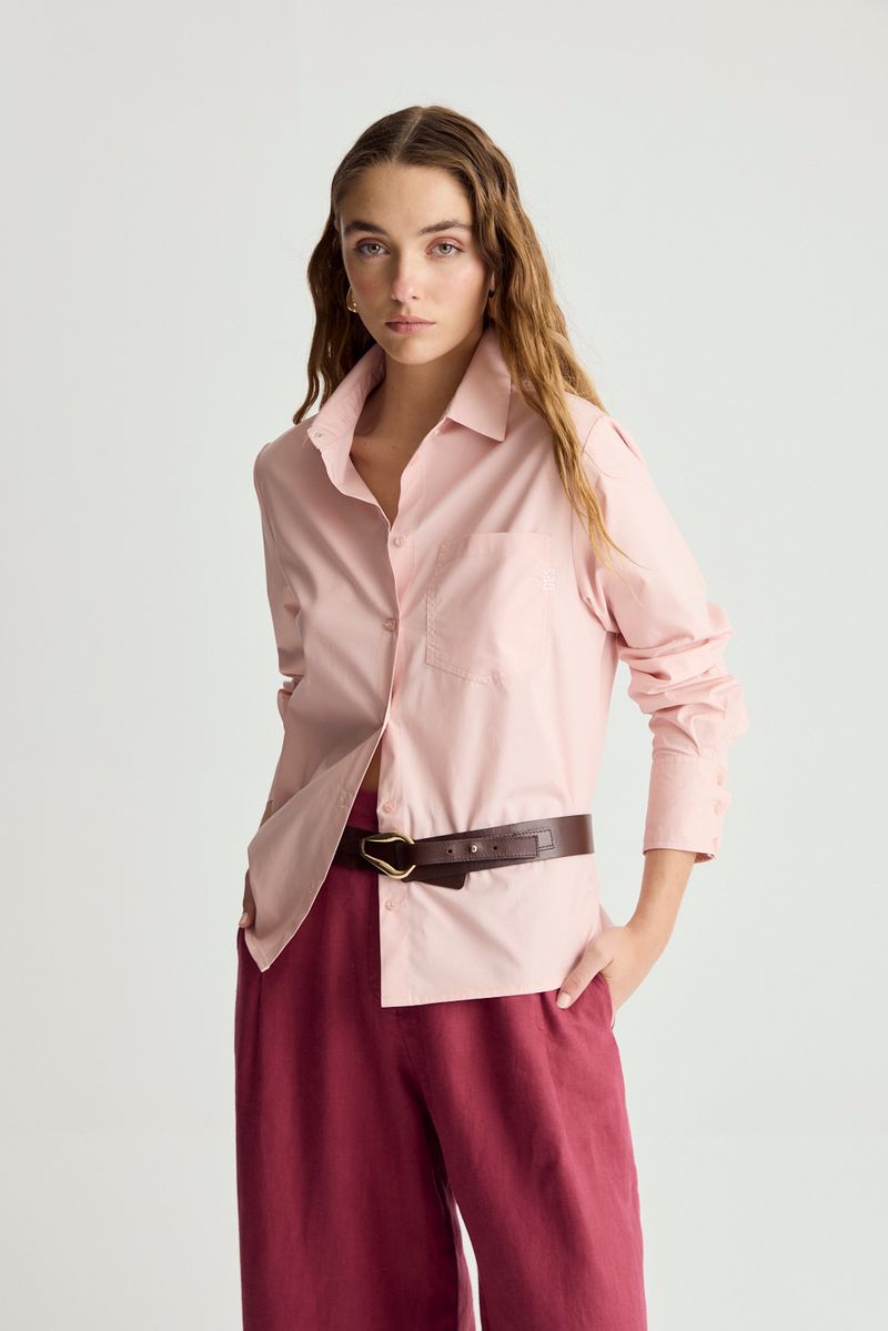 Camisa confeccionada en poplin de algodón,de calce regular.tiene cuello y cartera doble.en el frente,tiene bolsillo plaqué con bordado y mangas con tablas y puño.espalda con canesú y tabla encontrada con atraque.