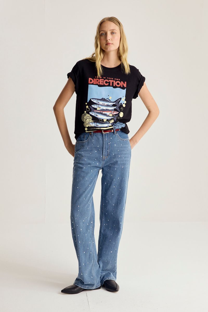 Jean de calce relajado, tiro alto y pierna recta. Realizado en denim intervenido con proceso de lavado efecto rayado y customizado con hot fix en diferentes formas y tamaños