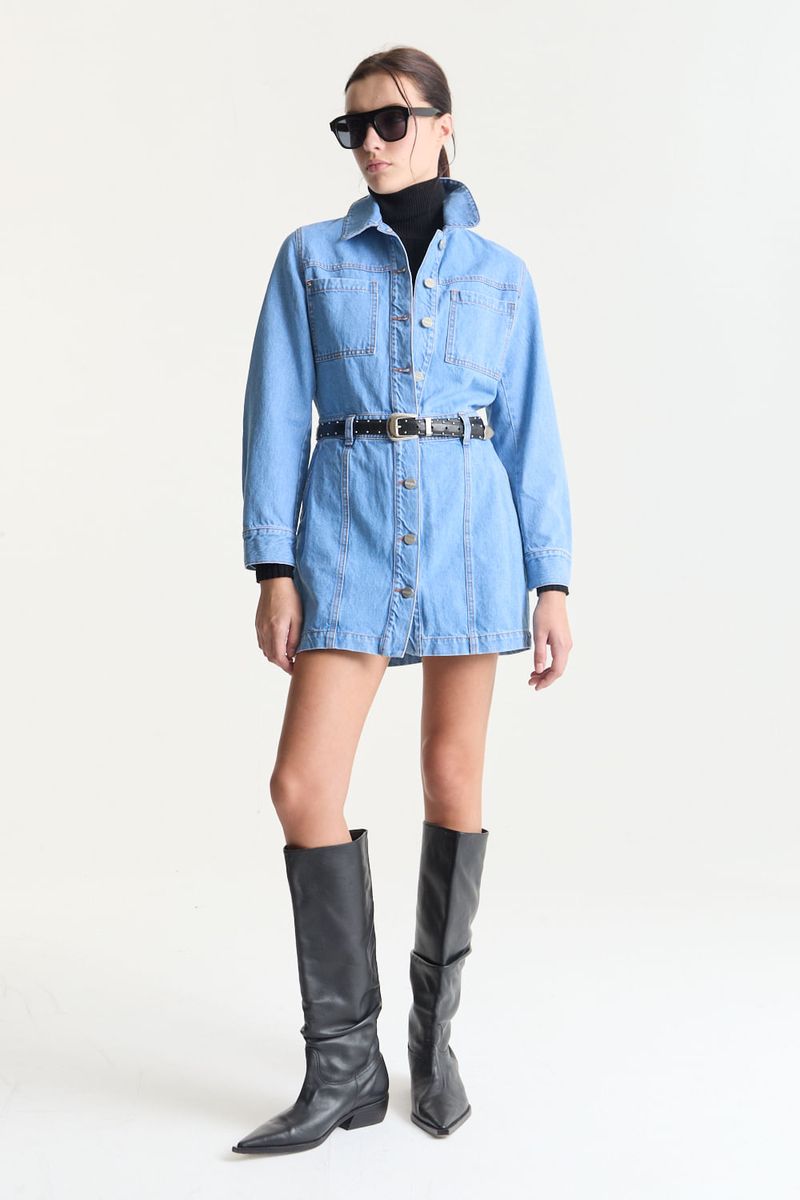 Vestido de calce regular con mangas largas y corto por encima de las rodillas. Realizado en denim 100% algodón con efecto lavado