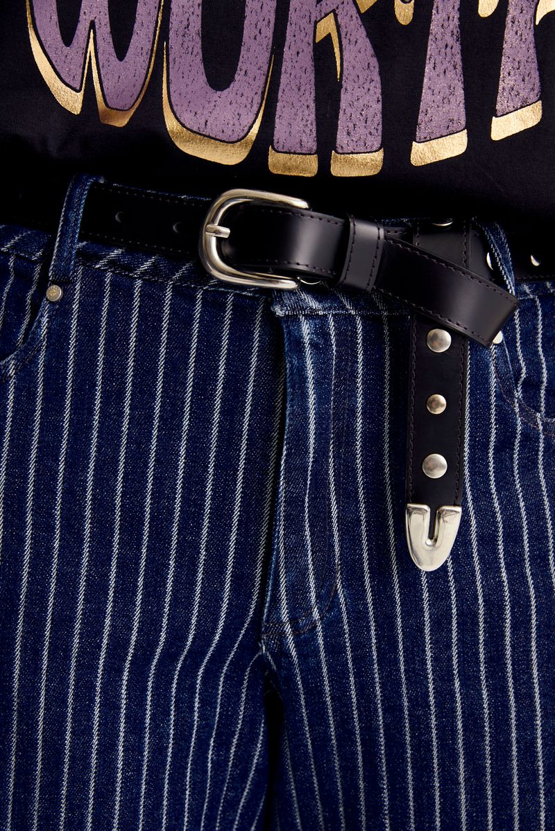 Cinturon realizado en cuero vacuno con tachas tipo bombe en todo su contorno. Posee juego de hebilla y puntera de zamac en color niquel. Es mas largo para anudar en la punta una vez colocado. Medidas t1:80 cm /t2 85 cm /t3 90 cm /t4:95 cm