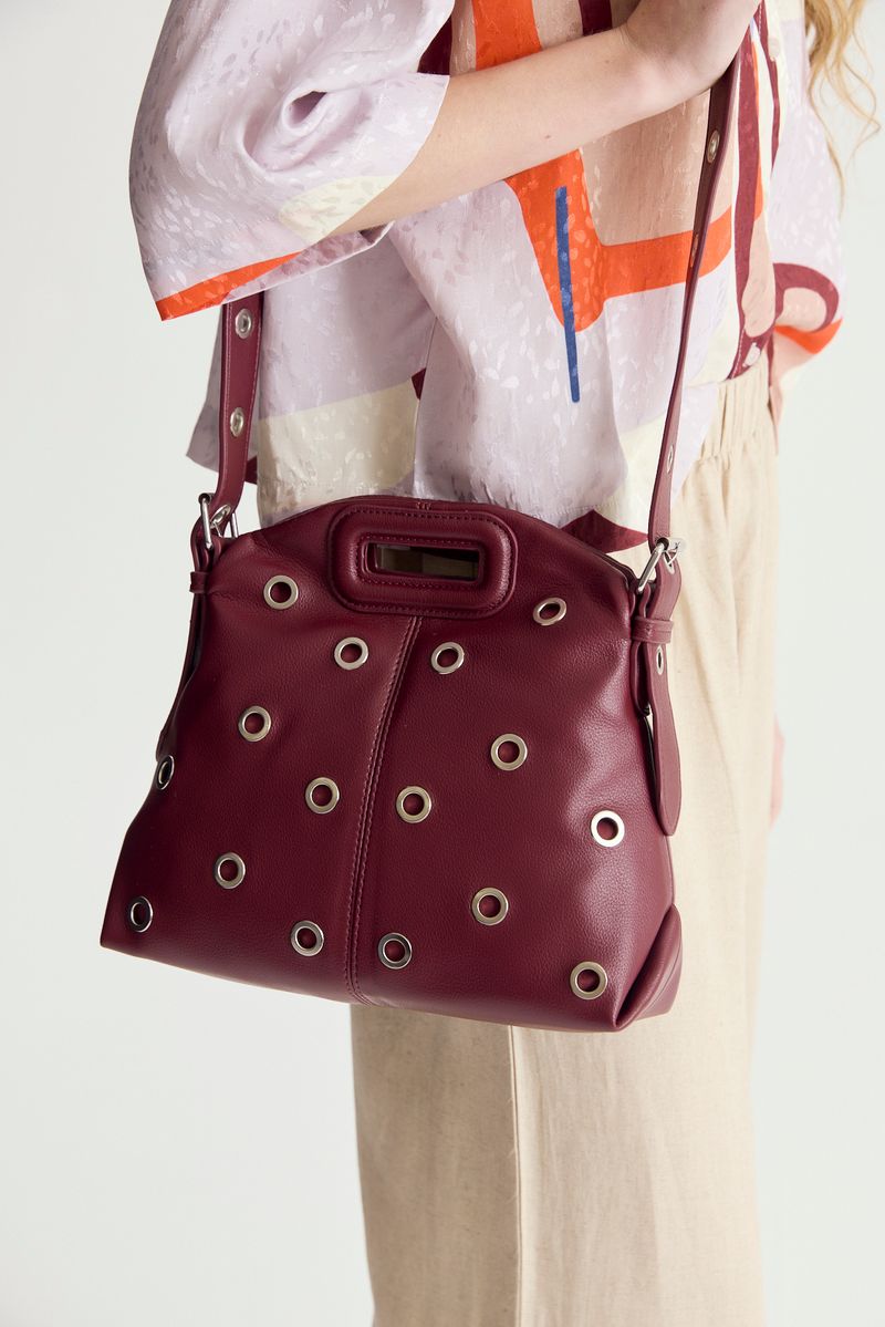 Cartera realizada en pu con ojalillos en sos dos caras, con correa regulable y manijas rigidas con cierre central. Medidas: 28 cm de ancho / 25 cm de alto / 5 cm de profundidad.