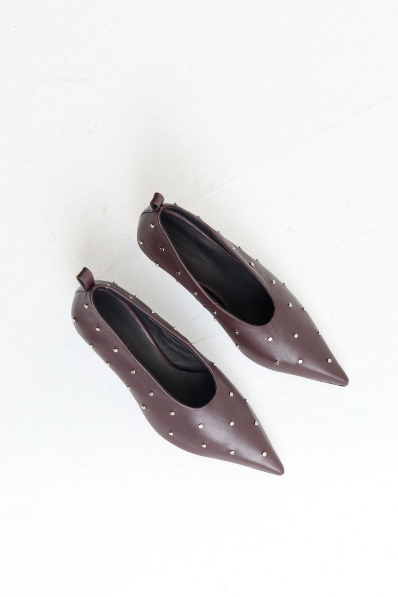 Zapato en punta realizado en cuero vacuno, con taco de 4 cm y posee tachas en toda su capellada.posee forreria de cuero