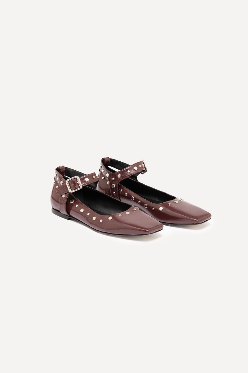 Balerina realizada en cuero vacuno semi charolado con punta cuadrada y tachas posee pulsera removible
