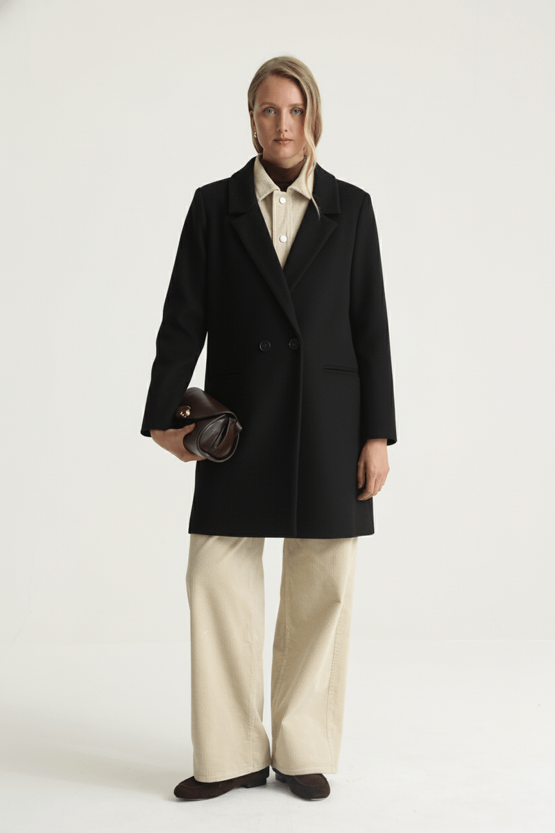 Abrigo de paño clásico, silueta recta con solapa sastrera y bolsillos en delantero. Lleva cruce en frente con botón. Largo modular arriba de la rodilla