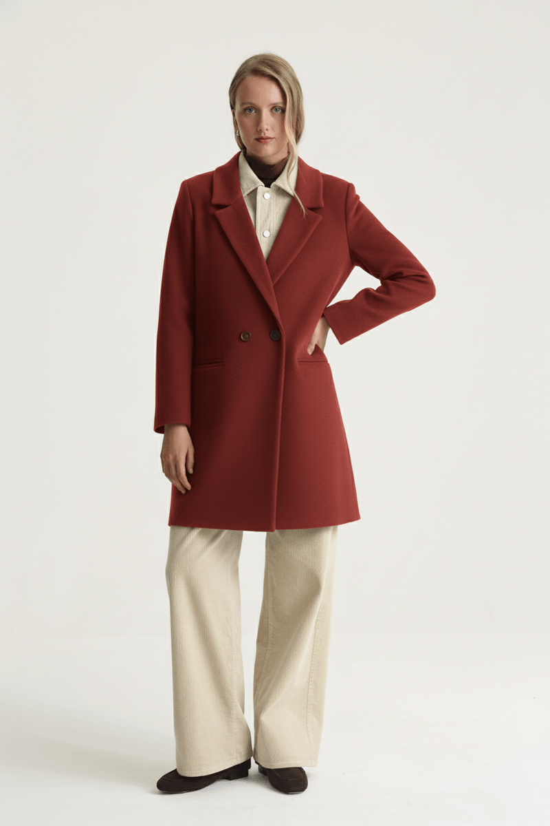 Abrigo de paño clásico, silueta recta con solapa sastrera y bolsillos en delantero. Lleva cruce en frente con botón. Largo modular arriba de la rodilla