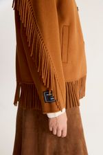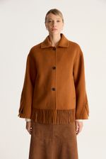 Abrigo hand made tipo chaqueta, con flecos en mangas ruedo y espalda. Sielueta tipo overshirt con botónes en delantero, cuello camisero y bolsillos. Largo a la cadera. Este abrigo contiene lana en su composición
