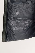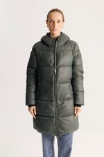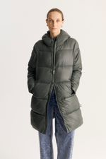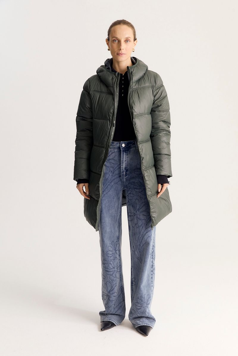 Campera de calce regular, con relleno liviano estilo ultra light. De largo por debajo de la cola, con matelasseado en rayas horizontales de doble pespunte