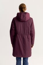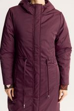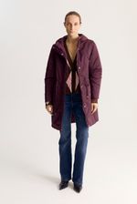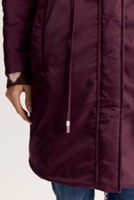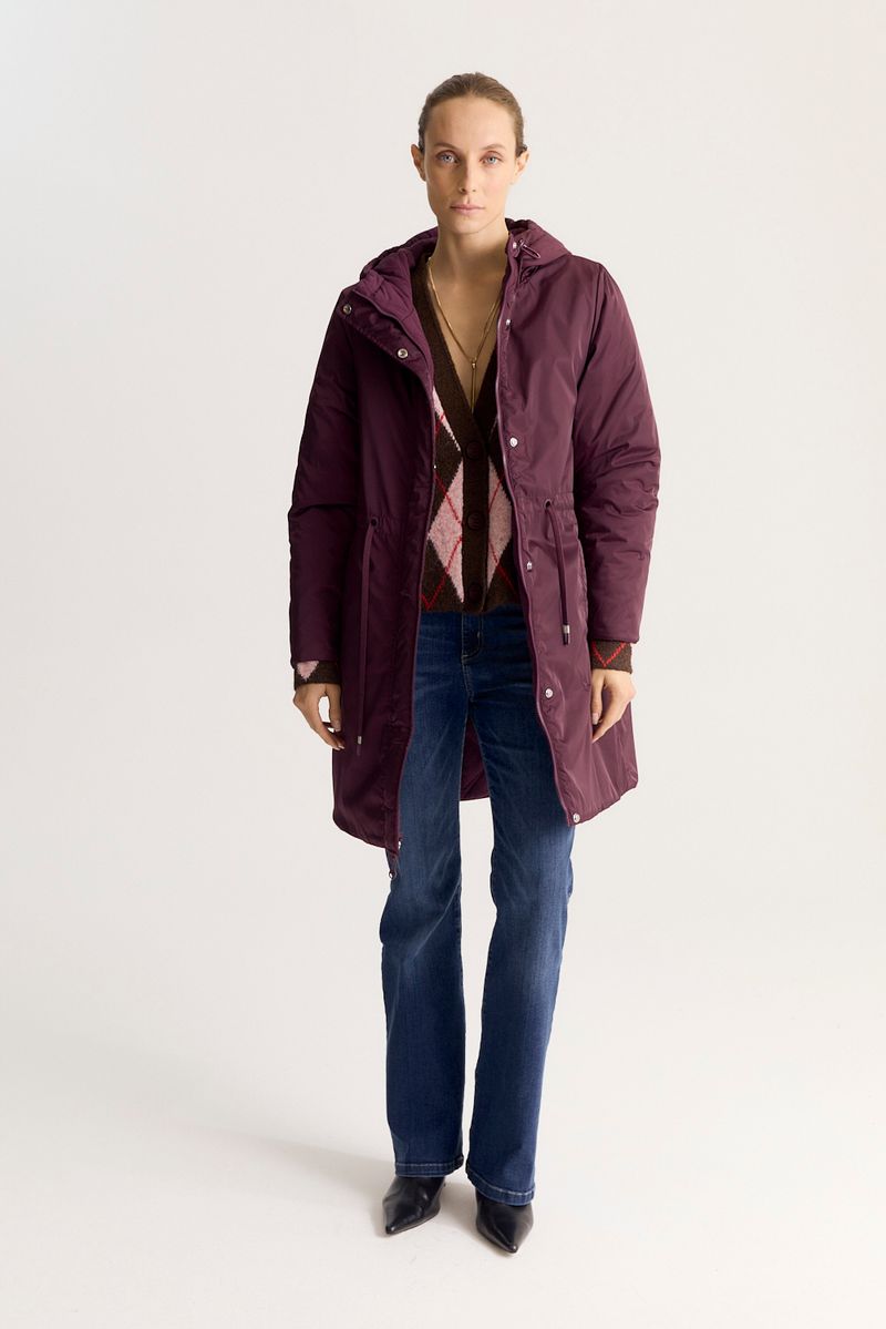 Campera de calce regular, reversible, de un lado un textil con textura y matelasseado geométrico personalizado. Del otro lado, un textil liso y algo brillante, con detalle de jareta de ajuste en la cintura