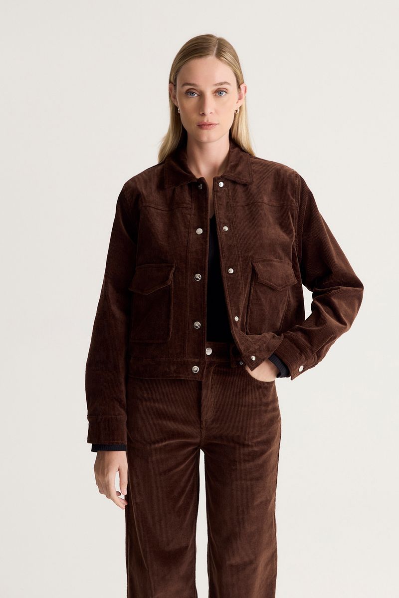 Chaqueta de calce regular, realizada en corderoy de basta ancha con elastano, lleva dos bolsillos plaqué con tapa en el delantero y tiene look jeanero. Total look con el pantalón corderoy.