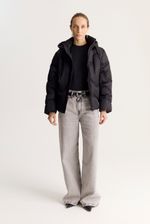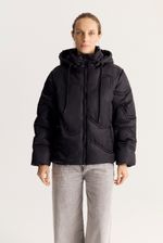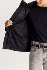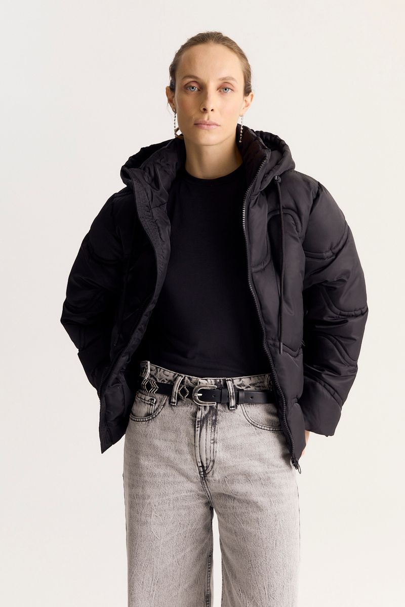 Campera de calce regular y relleno grueso, bien abrigada. Lleva detalle de matelasseado personalizado y está realizada en un tejido algo brillante. Tiene detalle de jareta interna que sirve de ajuste en cintura.