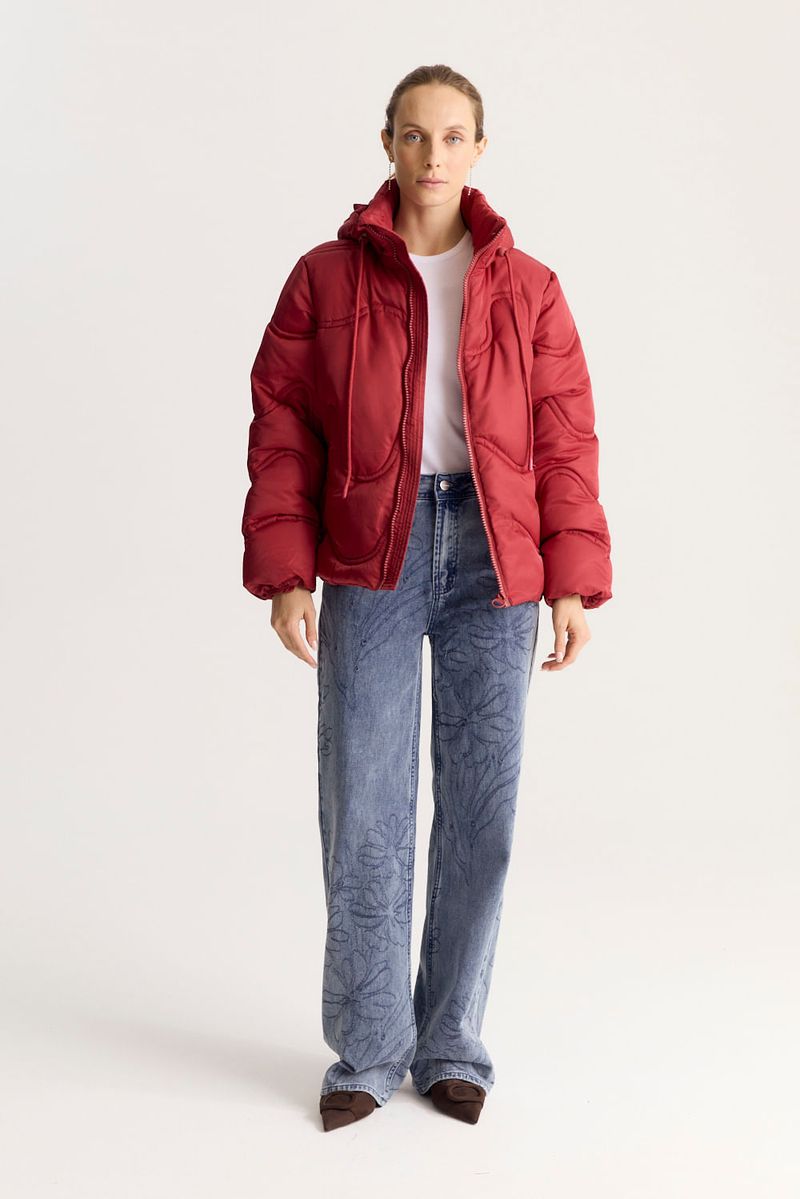 Campera de calce regular y relleno grueso, bien abrigada. Lleva detalle de matelasseado personalizado y está realizada en un tejido algo brillante. Tiene detalle de jareta interna que sirve de ajuste en cintura.